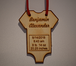 A plaque engraved on finished 1/8” birch wood and with a black-four inch high plastic stand.